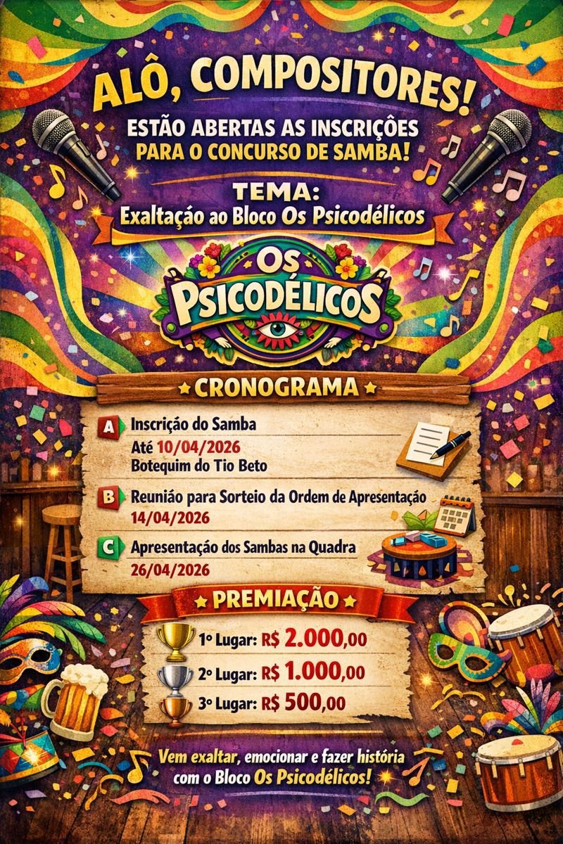 O Bloco de Samba Os Psicodélicos está com inscrições abertas, no Botequim do Tio Beto, até o dia 10 de abril para o concurso que vai escolher um samba em sua exaltação.