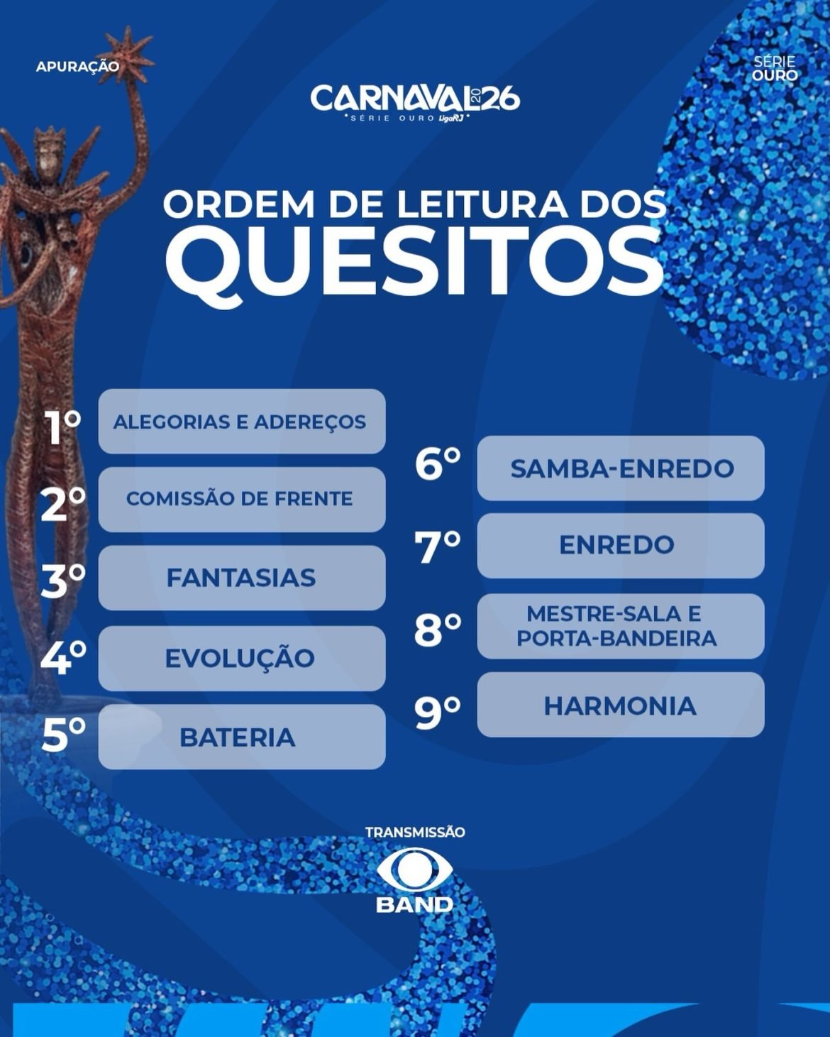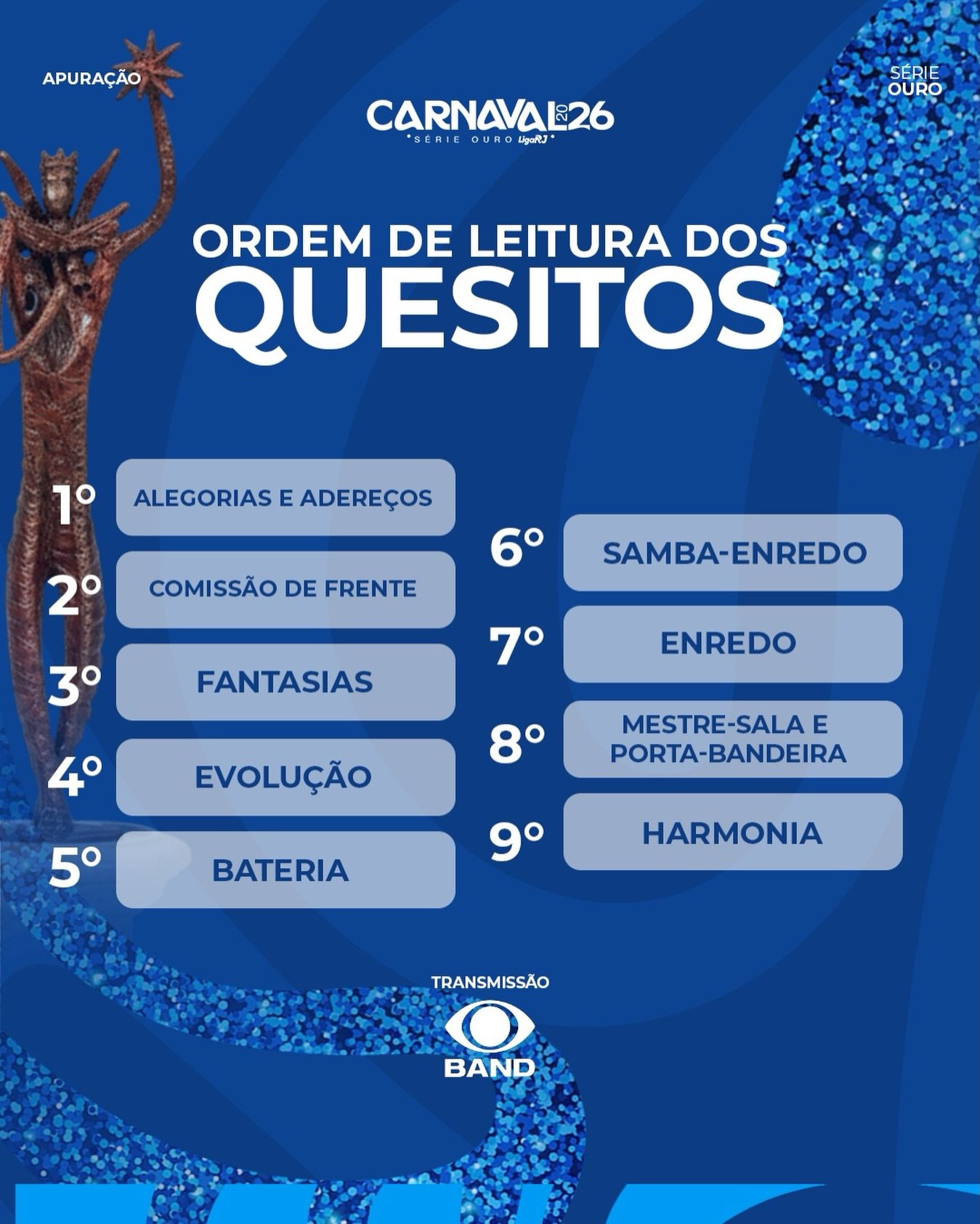 Na imagem acima pode ser vista a ordem de leitura dos quesitos na apuração dos desfiles deste ano da Série Ouro e no sentido inverso o critério de desempate.