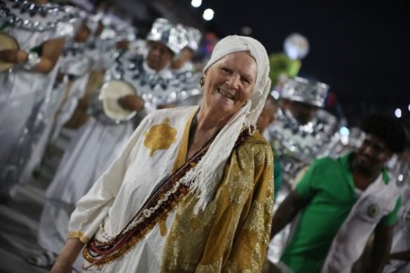 Maria Augusta Rodrigues, genial carnavalesca e julgadora do Troféu Estandarte de Ouro, orgulhosa à frente da bateria, da qual é madrinha, da Escola de Samba Império Serrano.