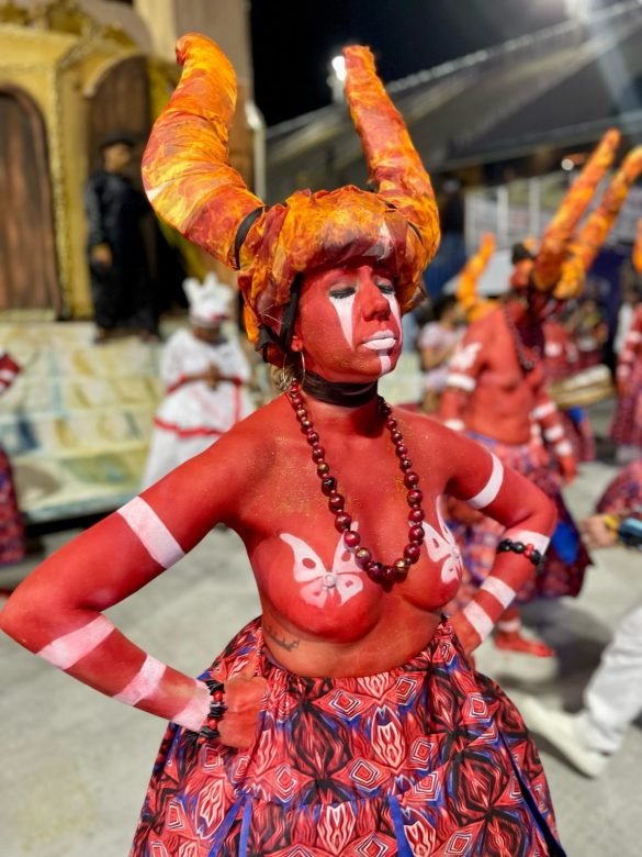 Foi um desfile baseado no sincretismo religioso envolvendo a católica Santa Bárbara e a orixá do Candomblé Iansã que mostrou uma estética muito interessante.